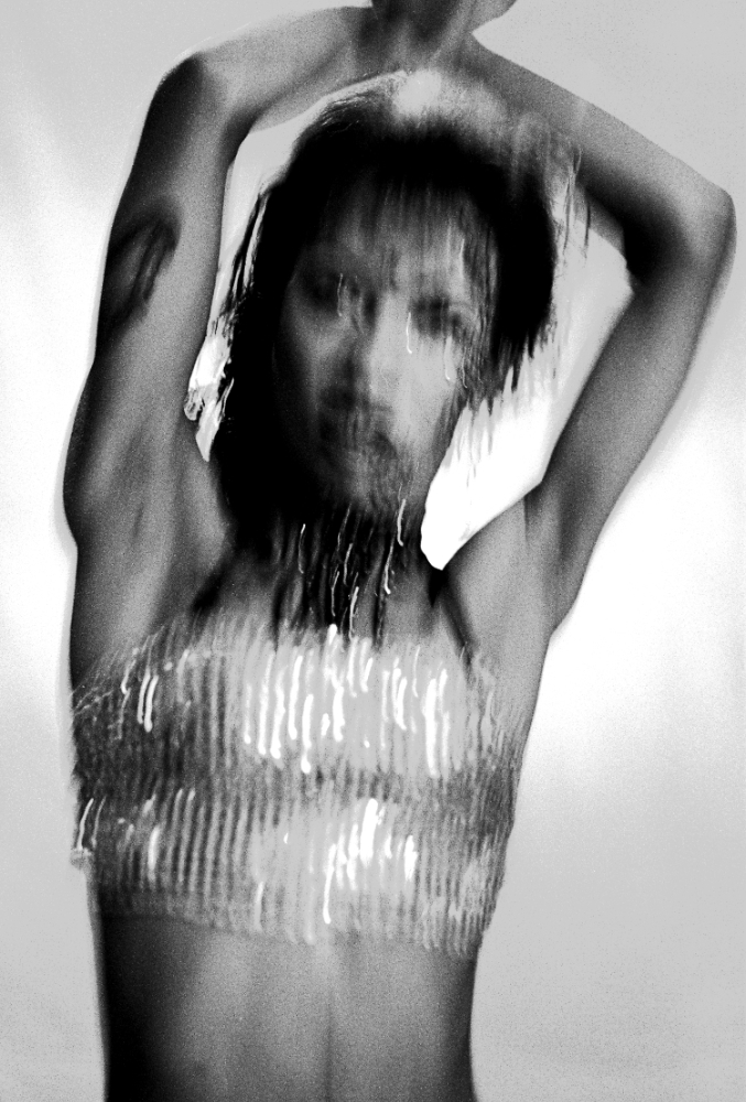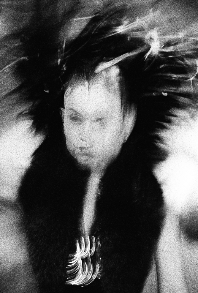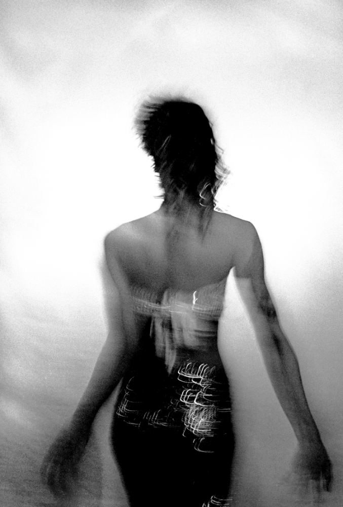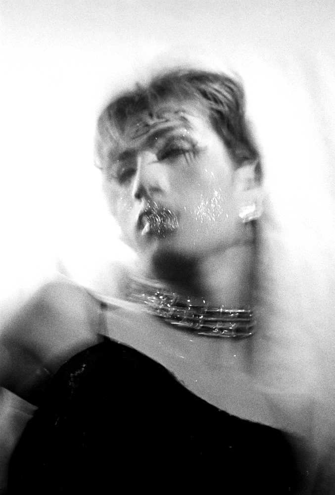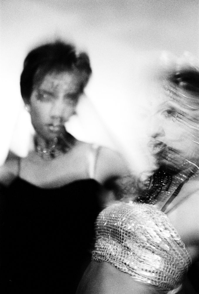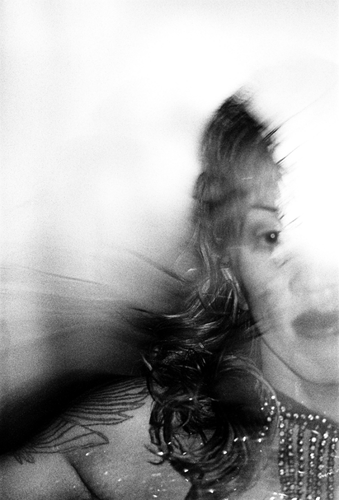 A studio was set up in a small nightclub to reproduce the dance show atmosphere with disco lights and music. As the dancers, in full costume, moved across the dance floor, I moved with them to match the high energy of their burlesque choreography. With an emphasis on blur, grain and contrast the encounter resulted in images that possess a chaotic energy.